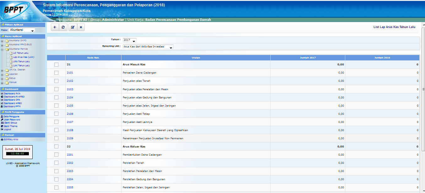Laporan Arus Kas (LAK) adalah edit data arus masuk dan keluar kas selama periode tertentu yang diklasifikasikan berdasarkan aktivitas operasi, investasi aset nonkeuangan, pembiayaan, dan nonanggaran