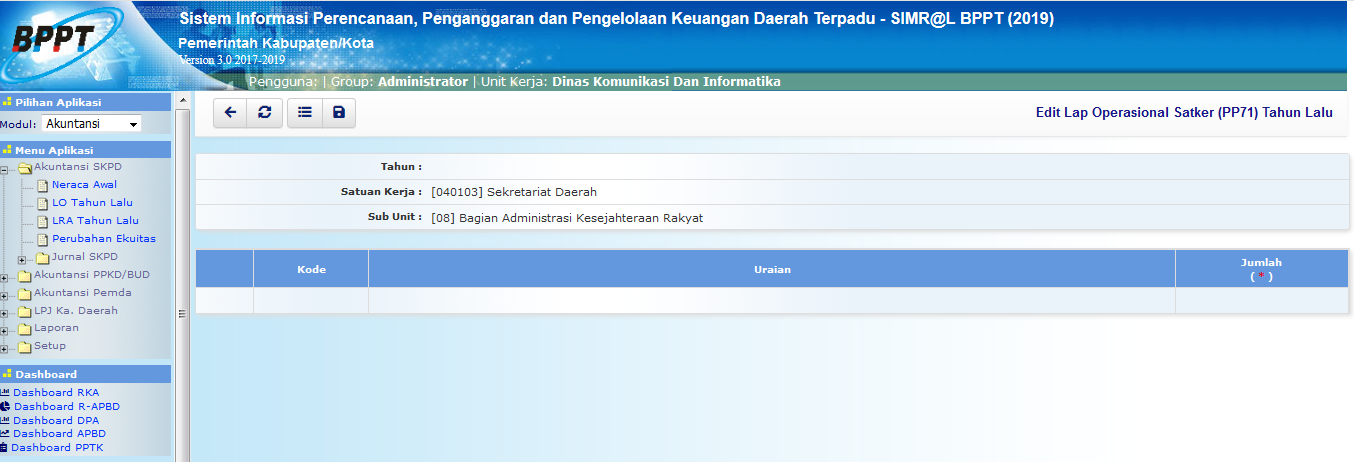 Fungsi LO Tahun Lalu adalah proses edit Laporan Operasional yang berupa Pendapatan LO, Beban, Surplus / Defisit Operasional dari laporan keuangan SKPD