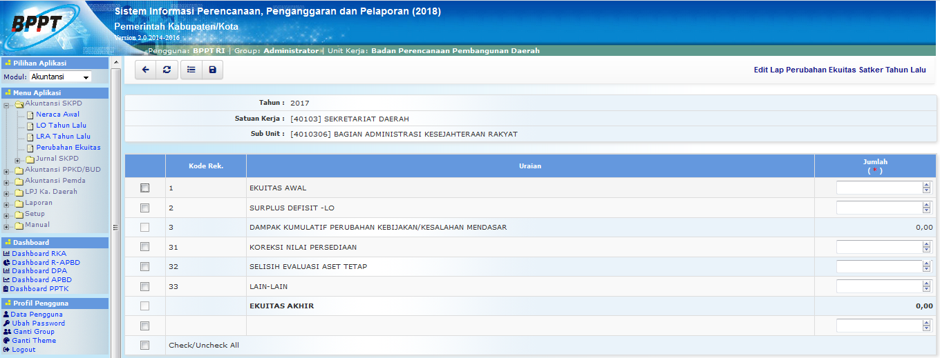 • Pilih modul AKUNTANSI > AKUNTANSI SKPD > Perubahan Ekuitas