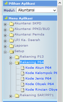 Menu untuk setup rekening mata anggaran BAS Permendagri 64/2013 dapat dilihat di modul Akuntansi > Setup > Rekening P64 sebagaimana dapat dilihat dibawah ini. Sedangkan untuk prosedur dapat mengikuti cara yang sama dengan proses pengisian di BAS Peremendagri 13/2006. Untuk melakukan mapping akan dijelaskan secara terpisah.