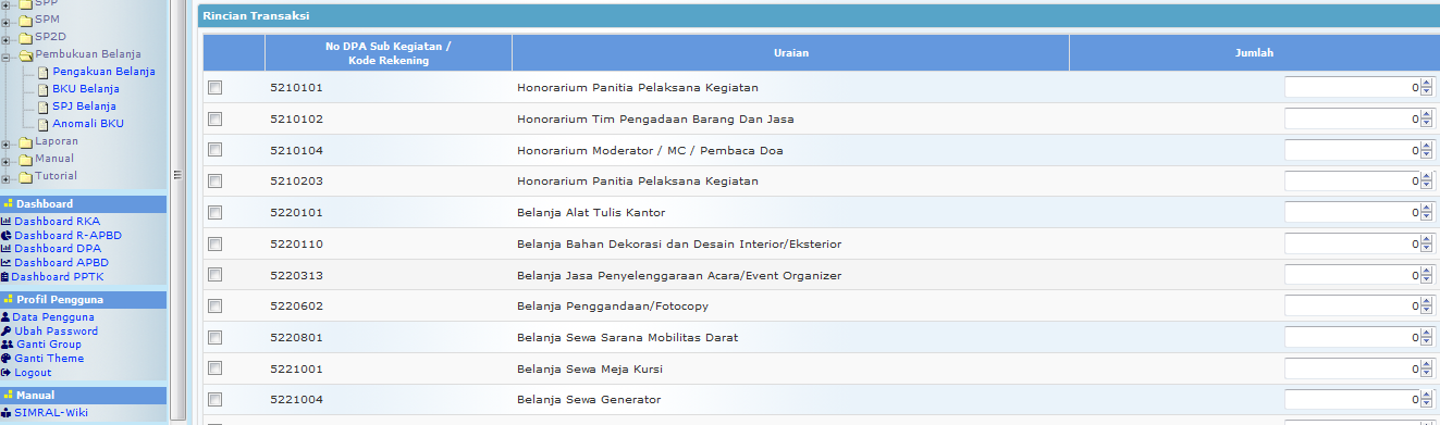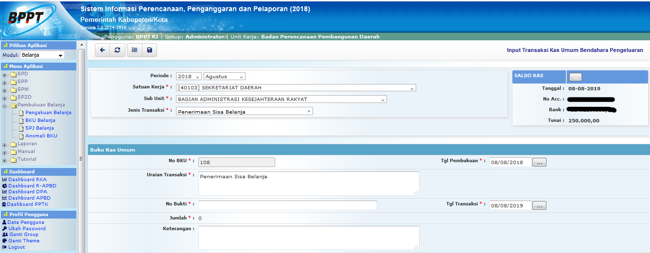 • isikan Jumlah sisa belanja pada Tabel Rincian Transaksi sesuai dengan DPA nya, Jumlah akan muncul pada Tabel Buku Kas Umum