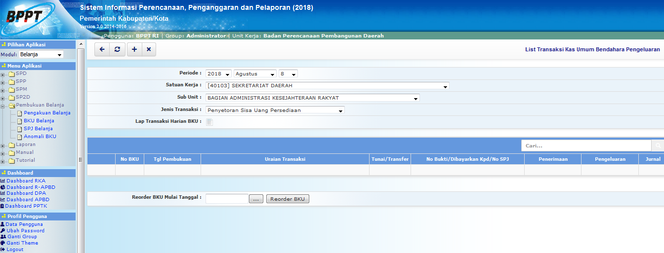 • Pilih Modul Belanja > Pembukuan Belanja > BKU Belanja Pilih satuan kerja, sub unit bila ada Pilih jenis transaksi Penyetoran Sisa Uang Persediaan tampak gambar berikut :