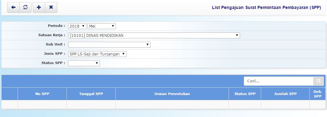 • Pilih Modul Belanja > Menu SPP > Pengajuan SPP,dan pilih Periode Pengajuan dan Jenis SPP (SPP LS Gaji dan Tunjangan), maka akan tampil list SPP LS Gaji dan Tunjangan pada unit kerja yang bersangkutan. Tampilan aplikasi sebagai berikut :