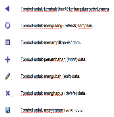 Pada bagian atas setiap tampilan tersedia toolbar dengan beberapa tombol standar didalamnya. Tombol-tombol yang tersedia adalah sebagai berikut :