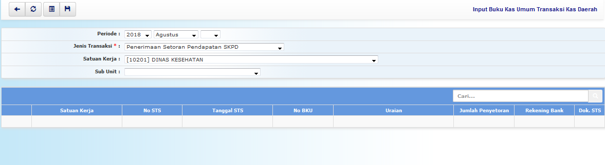 • Untuk mencatatkan transaksi Penerimaan Setoran Pendapatan SKPD yang telah dilakukan, tekan tombol maka akan tampil halaman dibawah ini :