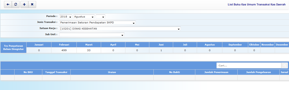 • Pilih Modul Kasda > Pembukuan > Buku Kas Umum Pilih tanggal periode, satuan kerja, sub unit bila ada * Pilih jenis transaksi Penerimaan Setoran Pendapatan SKPD, pilih Satker dan sub unit bila ada :