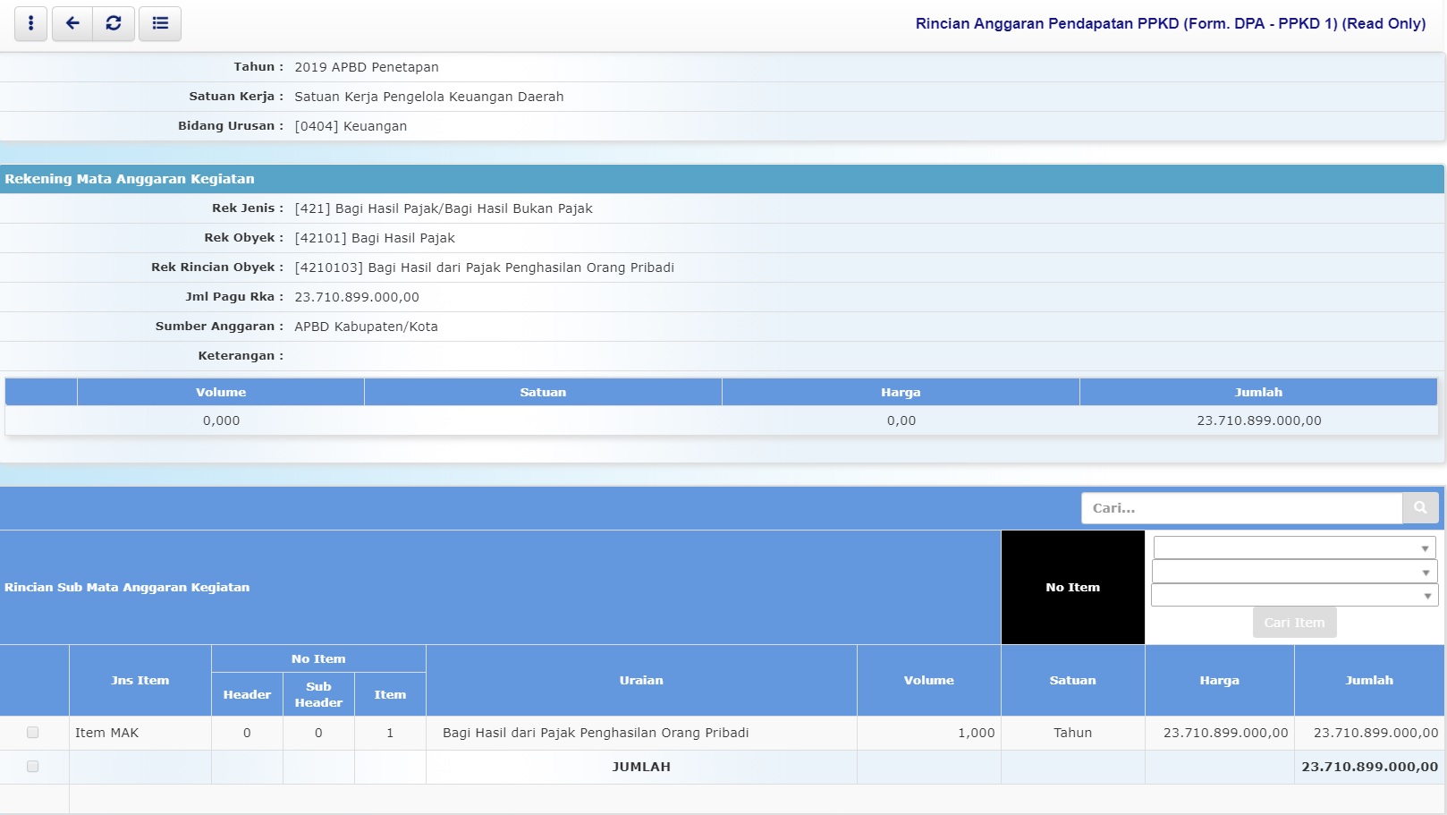 • Untuk melihat rincian anggaran Penerimaan PPKD, dapat dilakukan dengan menekan link pada kode rekening yang diinginkan, dan layar akan menampilkan berikut ini