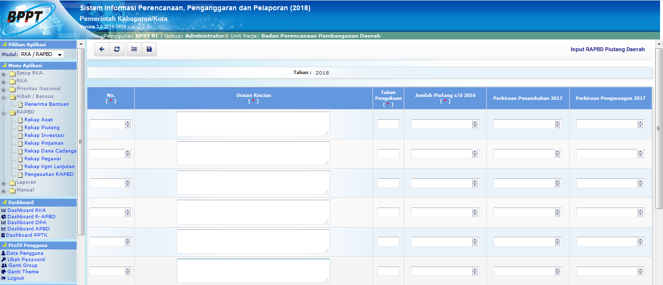 1Admin AnggaranMelakukan input piutang daerah pada tahun n-1, jumlah piutang sampai tahun n-2 dan perkiraan penambahan dan pengurangan tahun n-1