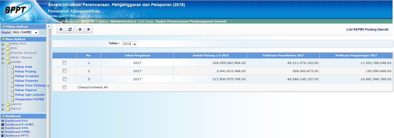 • Pilih RKA/RAPBD > Menu RAPBD , maka akan tampil List RAPBD Piutang Daerah. Tampilan Aplikasi sebagai berikut: