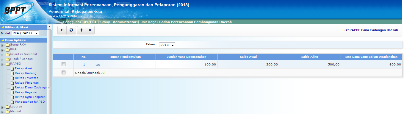 • Pilih RKA/RAPBD > Menu RAPBD , maka akan tampil List RAPBD Dana Cadangan Daerah sebagai berikut :