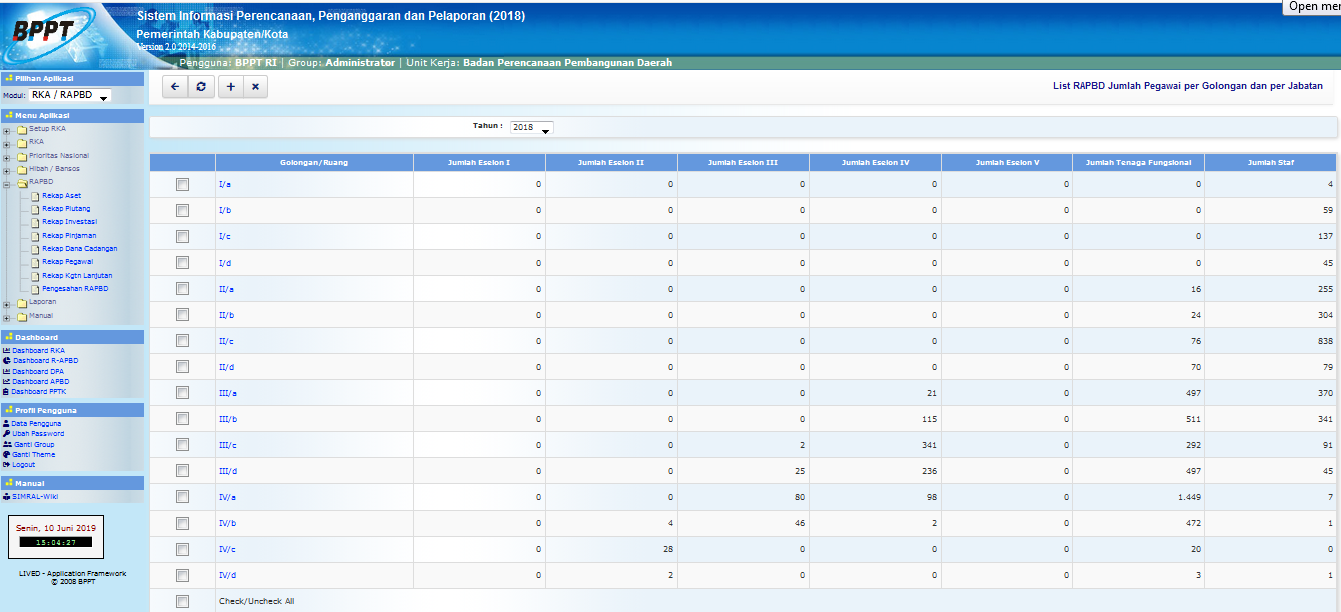 • Pilih RKA/RAPBD > Menu RAPBD , maka akan tampil List RAPBD Jumlah Pegawai. Tampilan Aplikasi sebagai berikut: