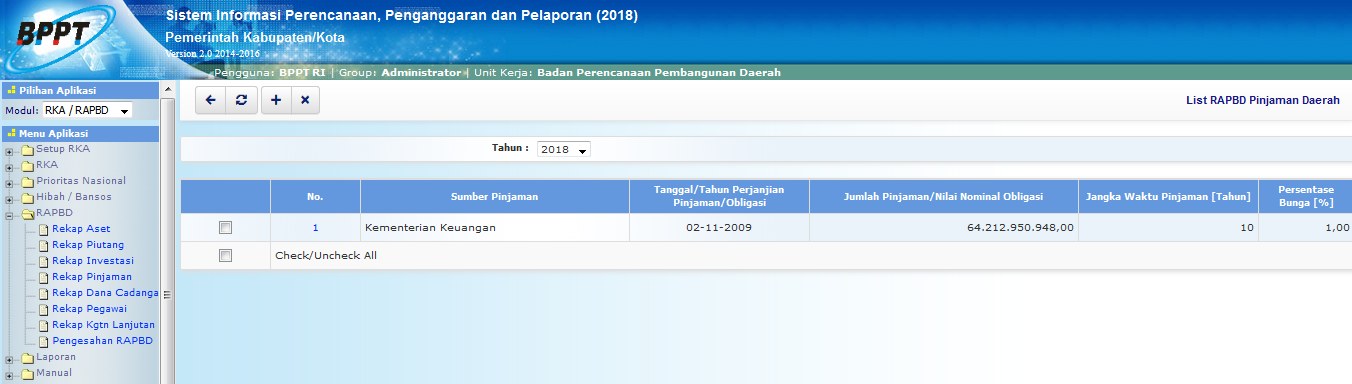 • Pilih RKA/RAPBD > Menu RAPBD , maka akan tampil List RAPBD Pinjaman Daerah. Tampilan Aplikasi sebagai berikut: