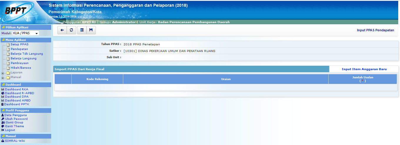 • Pilih KUA/PPAS > Menu Pendapatan , maka akan tampil List PPAS Pendapatan. Tampilan aplikasi sebagai berikut: