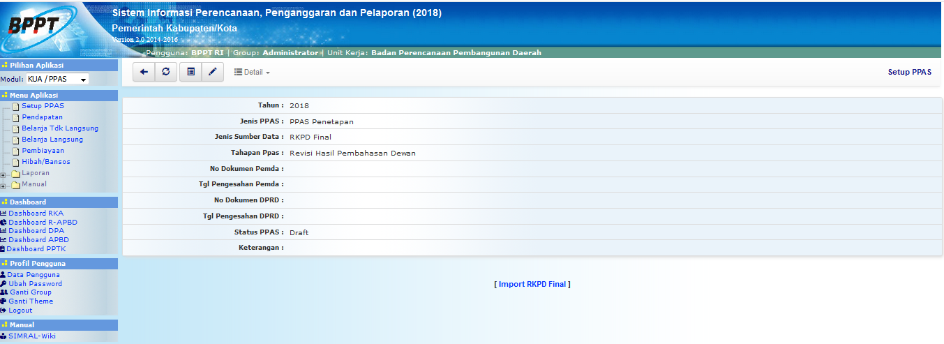 • Klik link [ Import RKPD Final ] yang ada di bagian bawah tampilan Setup PPAS untuk memulai proses import data RKPD Final.