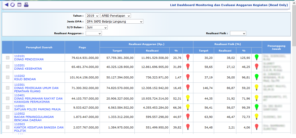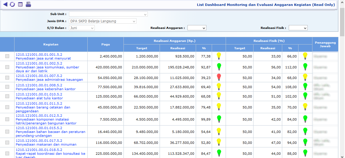 Berfungsi untuk menampilkan rekap capaian realisasi kegiatan di setiap OPD, baik realisasi anggaran dan realisasi fisik, ditam[pilkan secara berjenjang berikut dengan penanggungjawab kegiatan dan nilai capaian serta status capaian kegiatan per bulan, dan dapat ditelusur (drill down) hinga ke isian capaian masing-masing kegiatan per bulan. Nilai capaian realisasi dihitung secara penjumlahan untuk realisasi anggaran, dan secara rata-rata untuk realisasi fisik.