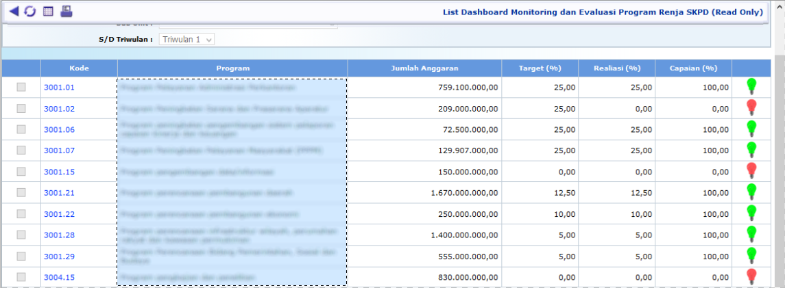 Berfungsi untuk menampilkan rekap capaian realisasi Program di setiap OPD, ditam[pilkan secara berjenjang berikut dengan penanggungjawab program dan nilai capaian serta status capaian program per triwulan, dan dapat ditelusur (drill down) hinga ke isian capaian masing-masing indikator program per triwulan. Nilai capaian realisasi dihitung secara rata-rata.