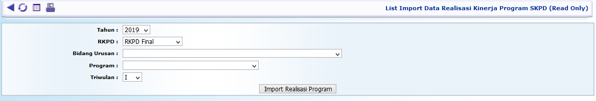 • Kolom Program diisi dengan nama program sesuai bidang urusannya yang akan diimport, jika dikosongkan berarti semua program di bidang urusan tersebut akan diimport