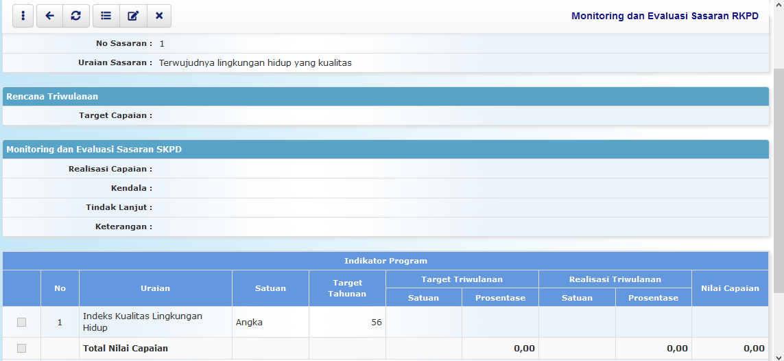 • Untuk pengisian data atau melihat lebih detail terkait target capaian masing-masing indikator sasaran, pilih uraian sasaran (klik) yang dikehendaki, maka akan ditampilkan