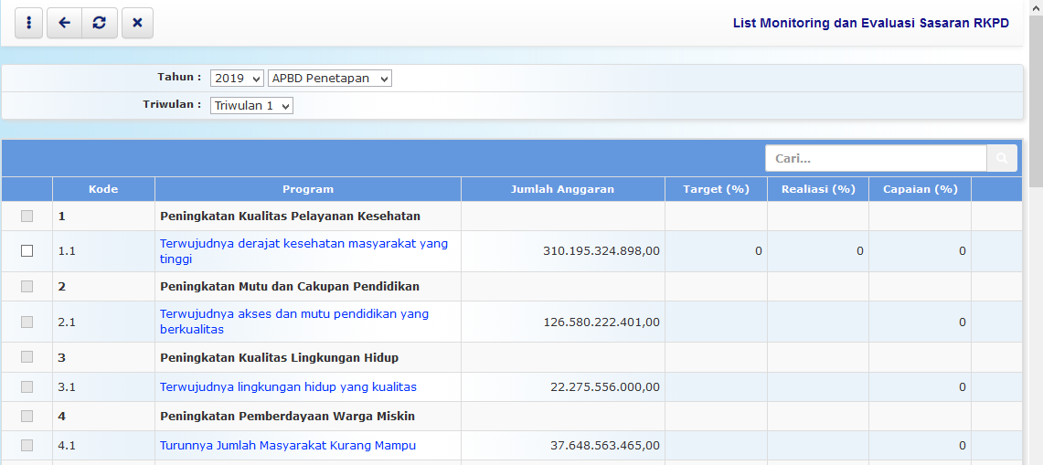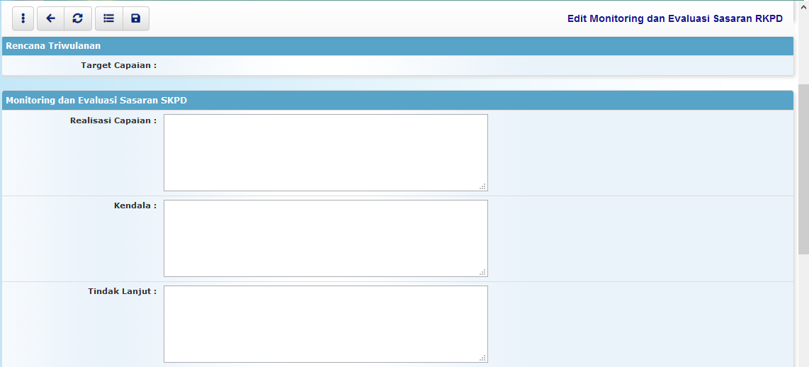 Prosedur ini berfungsi untuk penyediaan data capaian realisasi sasaran tahunan Pemda yang telah ditetapkan di RKPD. Data capaian realisasi per triwulanan terdiri dari 3 jenis data yaitu berupa :