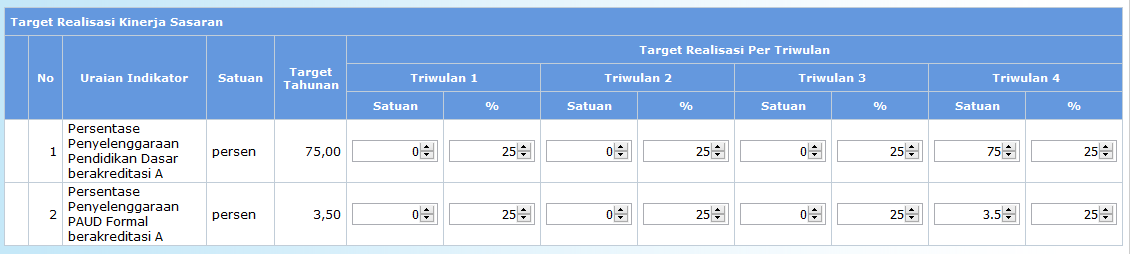 • Isikan nilai target realisasi dari masing-masing indikator sasaran per triwulan, baik nilai berdasarkan satuan ataupun berdasarkan prosentase target capaian program. Nilai yang diisikan tidak kumulatif.