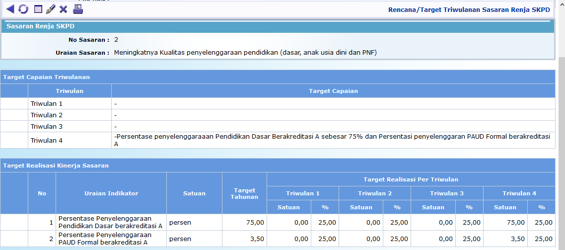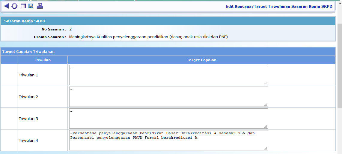 • Untuk pengisian data atau melihat lebih detail terkait target capaian masing-masing sasaran, pilih uraian sasaran (klik) yang dikehendaki, maka akan ditampilkan target realisasi per triwulan untuk masing-masing indikator sasaran, sebagaiaman tampilan berikut