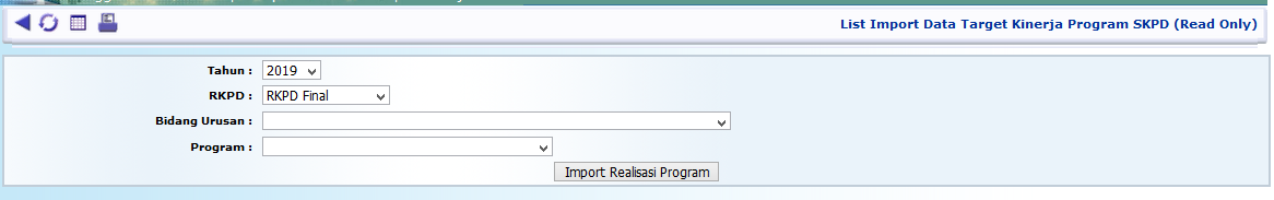 • Kolom Program diisi dengan nama program sesuai bidang urusannya yang akan diimport, jika dikosongkan berarti semua program di bidang urusan tersebut akan diimport
