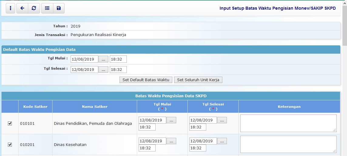 • Isikan default Waktu Pengisian (jam dan menit), kapan pengisian dimulai dan kapan pengisian ditutup, kemudian tekan tombol Set Default Batas Waktu untuk mensetiing batas waktu semua OPD yang tampil dilayar secara default, untuk bisa disesuaikan kembali per OPD. Atau tekan tombol Set Seluruh Unit Kerja untuk menyimpan batas waktu untuk seluruh OPD.